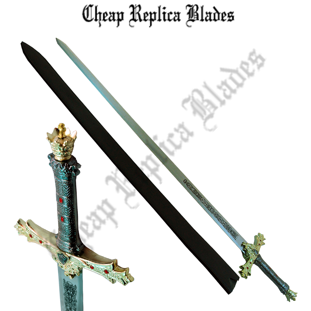 The King Arthur sword is one of the most demanding medieval swords of all time. The Excalibur sword features a long stainless steel blade with black engravings on it. The heavy metal guard has a bras finish along with the small gemstone attachments. The hilt of the king Arthur sword is also heavily engraved and is very delicate. The crown shaped pommel is truly an artistic thing that defines the sword well. We also give a free wood display stand with the Excalibur sword for providing a complete package for all the fantasy swords lovers.