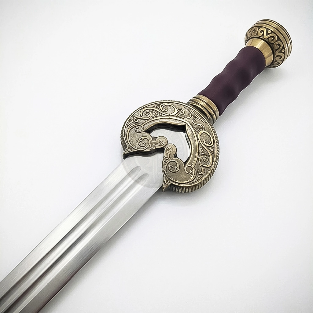The King Theoden sword is here for all the lotr swords collectors. This movie sword has a graceful and unique design that no other replica sword possesses. Take a look at its groovy hilt and guard. The heavy metal pommel contains an antique brass finish with carvings. The complex hilt’s structure possesses a matchless wood finish. The guard is the most striking thing in this lord of the rings sword. The shape of guard is quite similar to that of a heart containing two framed horses with an antique brass finish and engravings.